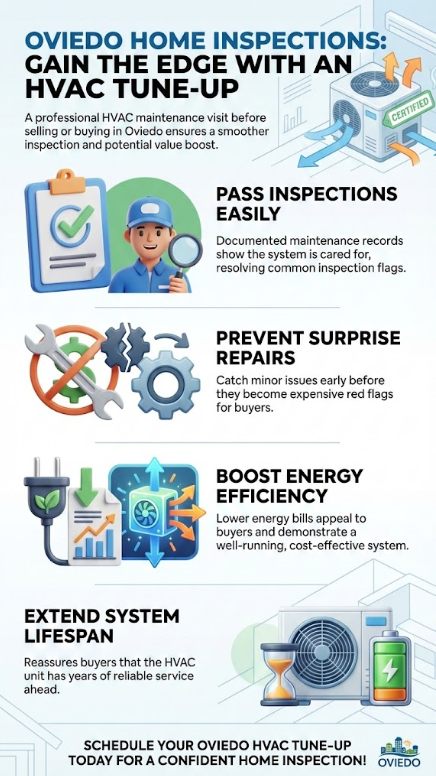 Oviedo's heat and humidity push HVAC systems harder than most markets. That constant demand accelerates wear on components that home inspectors specifically evaluate. A tune up before your inspection doesn't just check a box. It directly addresses the failure points inspectors are trained to find.
